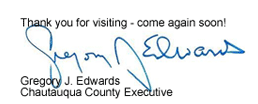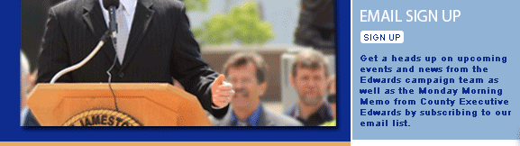 New York State Senator Charles Schumer on Edwards' leadership at the opening of Methane to Electric Power Plant in Chautauqua County. "I want to thank you, Greg, for your dynamic, forward-thinking, bipartisan, and just what's good about government--leadership in Chautauqua County. I see County Executives all over the state, we have eighteen, and he is at the top of the list. He has really done a great job here in every way, and this plant that we are dedicating today is an example of that because it is so forward-thinking" New York State Senator, Cathy Young (click to hear Radio endorsement) "While I have been fighting big government in Albany to bring relief to taxpayers, I have had a great partner doing the same in Chautauqua County Government - Greg Edwards. As county executive, Greg Edwards has a proven track record of consolidating departments and eliminating unnecessary government jobs while still improving services. That's a record to be proud of. But what's most impressive is that the tax rate has gone down every single year that Greg Edwards has been in office. He is a true taxpayers' watchdog. So, on Election Day, please vote to re-elect Greg Edwards as County Executive.
